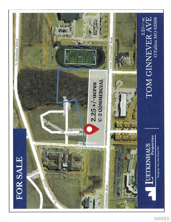 2.25+/- acres available in a GREAT location on busy Tom Ginnever Ave. It is a portion of a larger parcel and partly wooded. Wooded acreage is estimated. Extremely large residential population with private and public high schools just down the road. Right in front of NEW Meadowood Estates. O'Fallon Hoots Baseball at CarShield Field is near as well! Don't miss this opportunity for commercial property in O'Fallon!