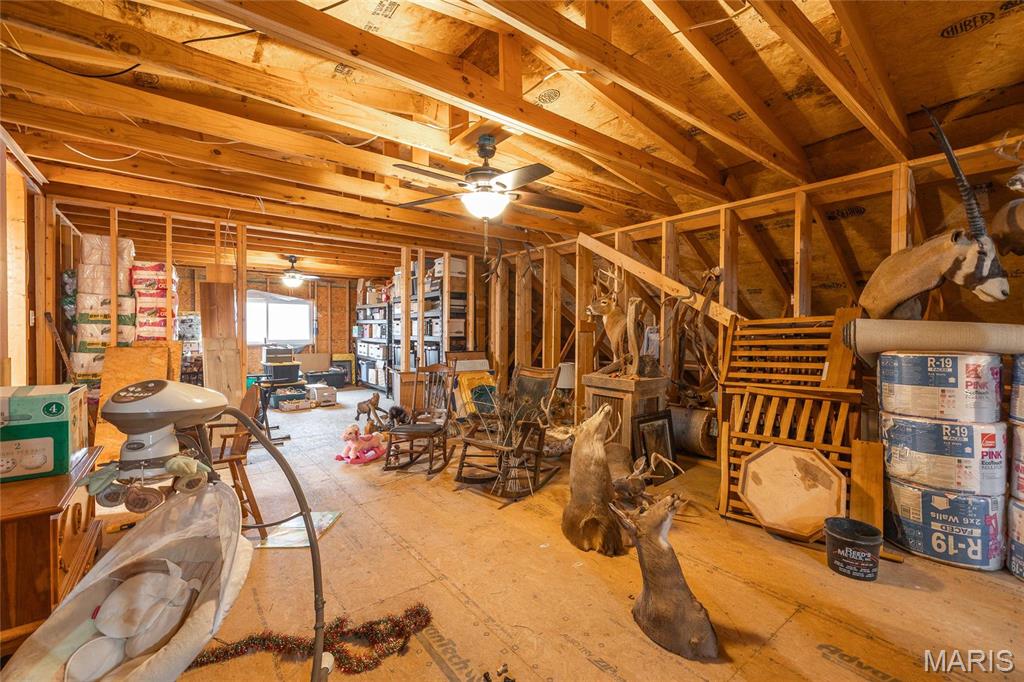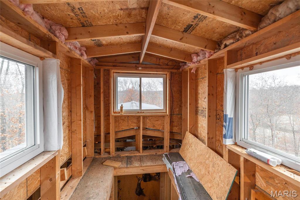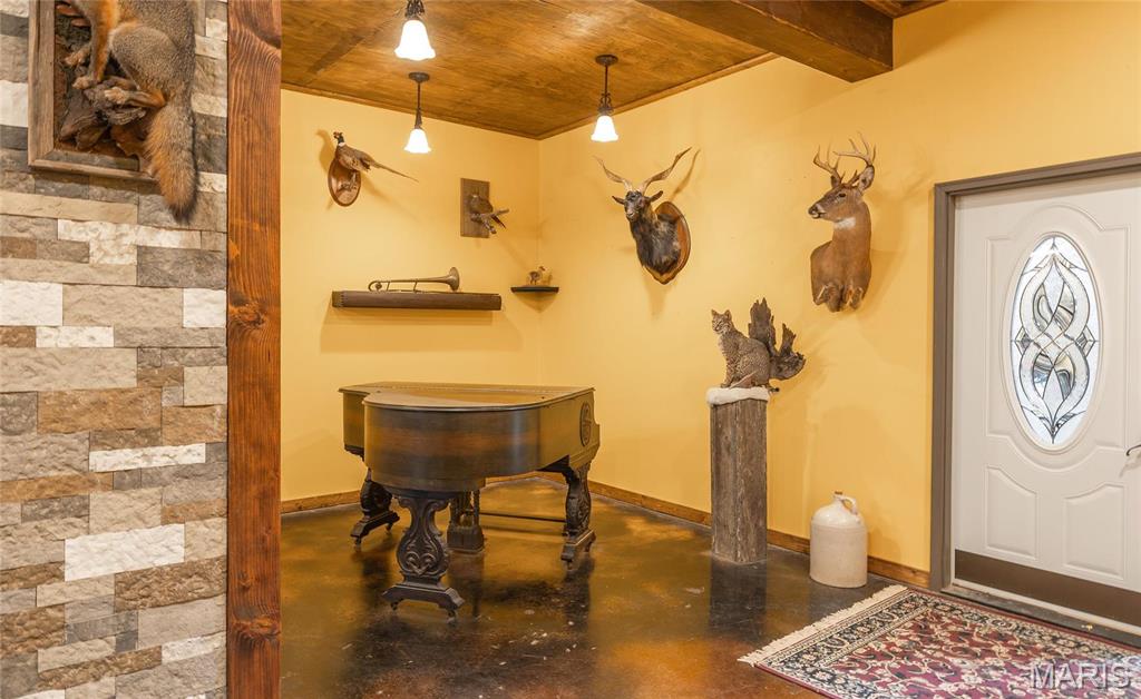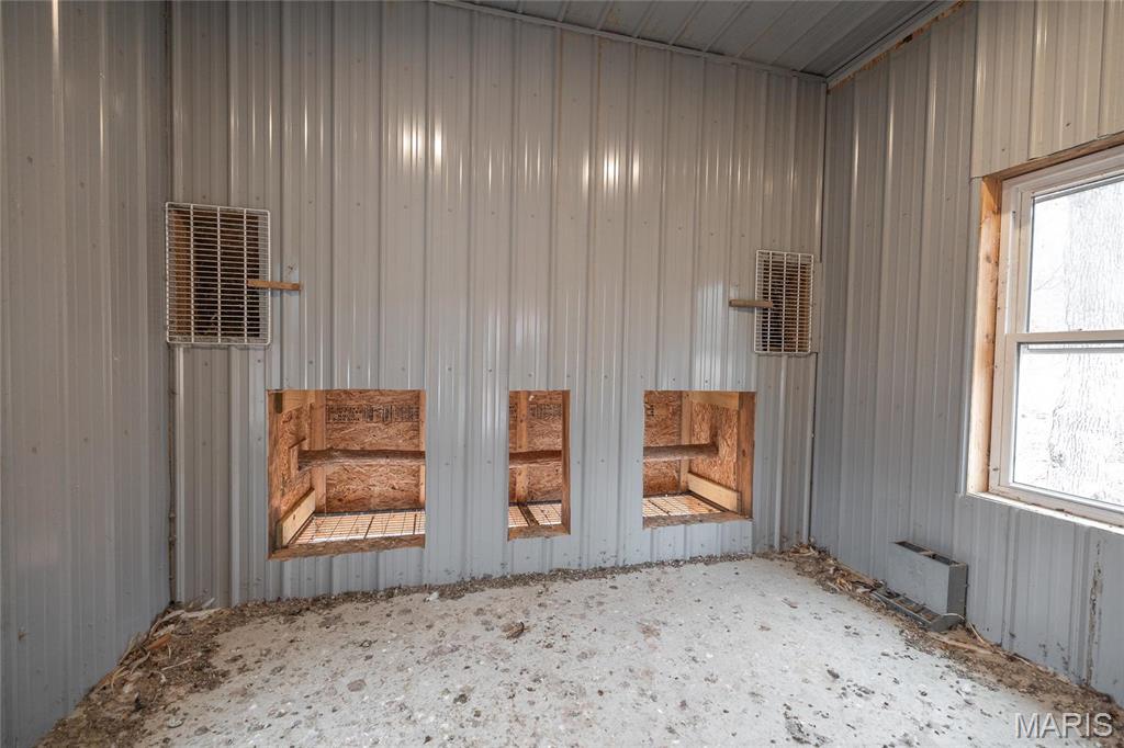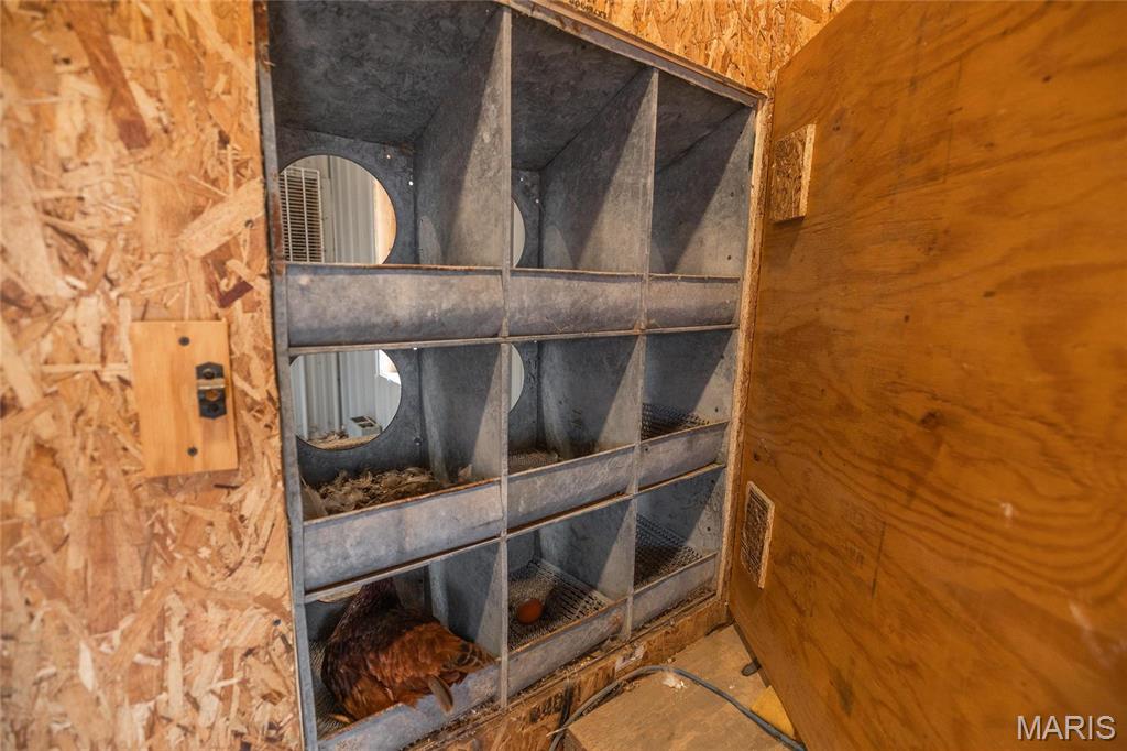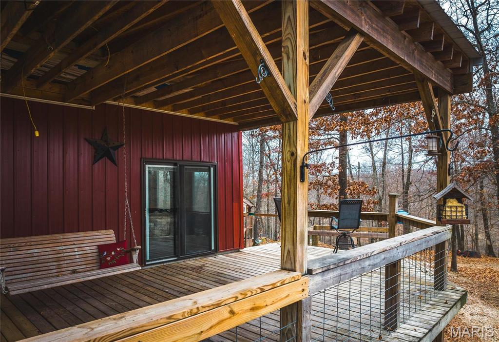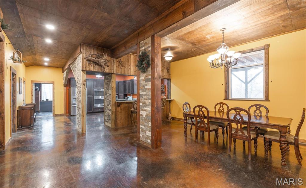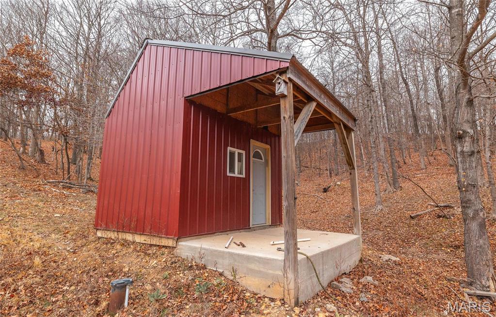 Nestled on 67 wooded acres this property is a recreational paradise & a hunter's dream. The grounds boast a diverse array of wildlife, including deer, turkeys & more. It backs up to Apple Creek Conservation Area, providing additional hunting opportunities. A wet weather creek graces the northwestern corner where several fossils and artifacts have been found. Located in the esteemed Jackson School district, the barndo house features over 7000sqft with stunning concrete flooring with radiant floor heat. Custom cabinetry & trim work adorn the interior while a storm shelter adds a layer of security. The 3rd level offers ample storage space. Beyond the house is a chicken coop, a woodshed with a stove, a tack shed for equine equipment, a run-in shelter, 2 hay barns & a well house as well as an extra foundation sets the stage for future expansion. With breathtaking views of the bottomlands below, this property seamlessly combines natural beauty with thoughtful design.
